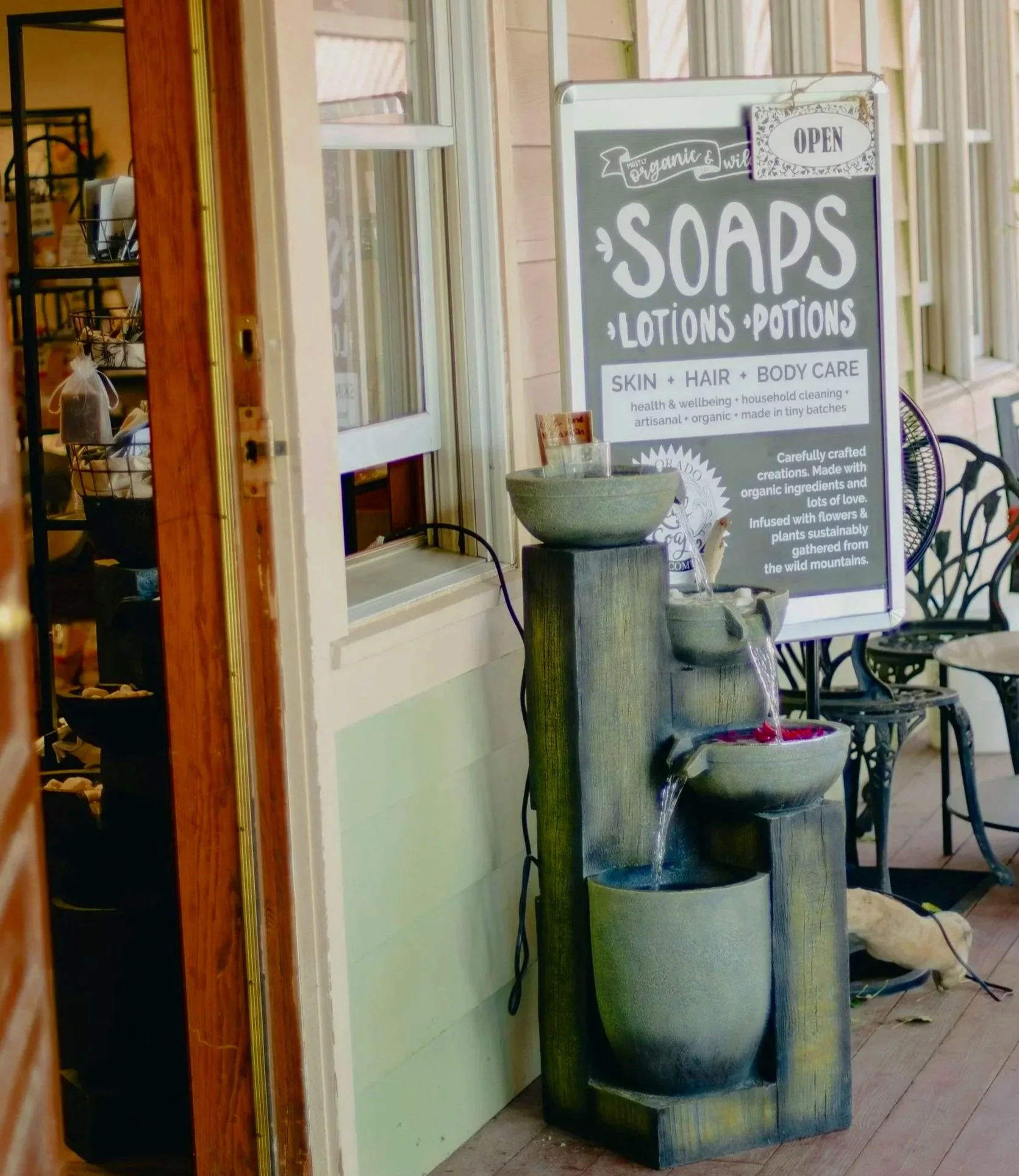 My door is on the porch above Alley Hats, under the big Aspen tree.
